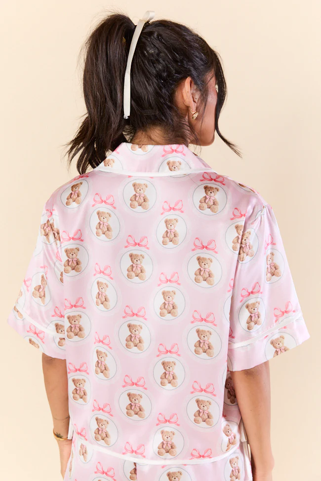 Snuggled Up Teddy Bear Printed Contrast Tie Detail Satin Short Sleeve Pajama Top