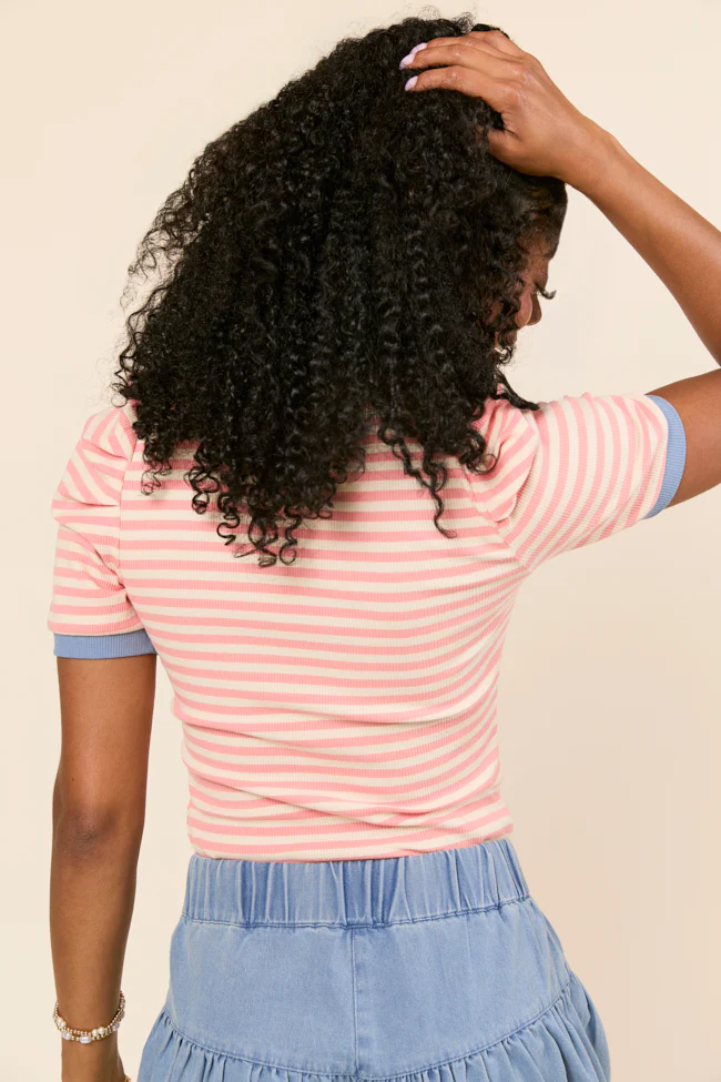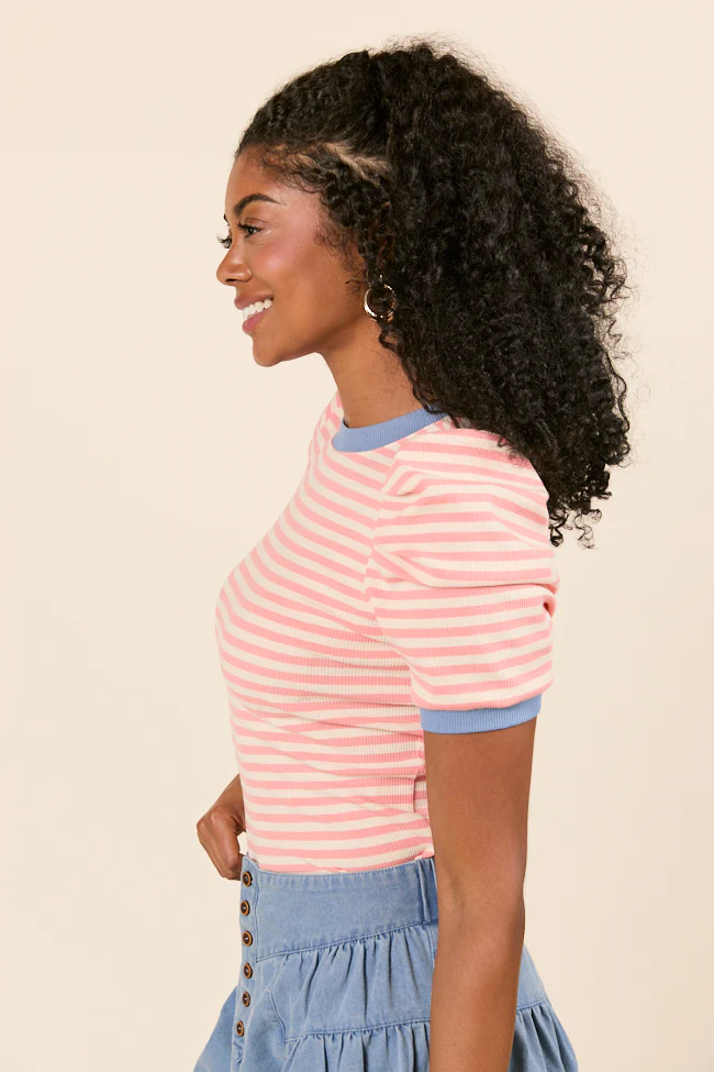 Hagan Gathered Short Sleeve Coral Stripe Knit Tee