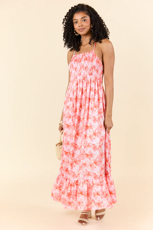 Floral Symphony Pink and Orange Smocked Maxi Dress FINAL SALE