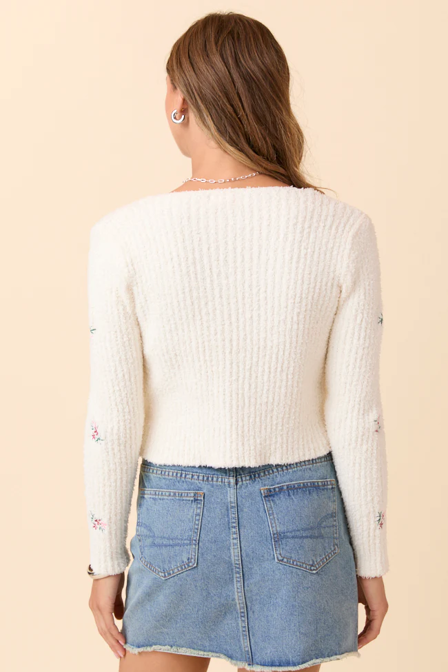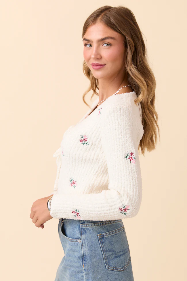Jordyn Long Sleeve Ivory Tie Front Floral Embroidered Cardigan