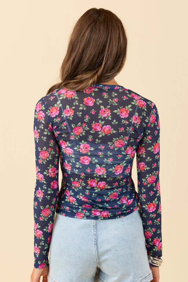 Ansley Long Sleeve Blue Floral Mesh Crewneck Top DOORBUSTER